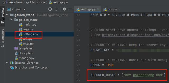 在settings.py中,将dev.goldenstone.com这个域名加入到 ALLOWED_HOSTS 中: