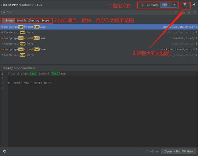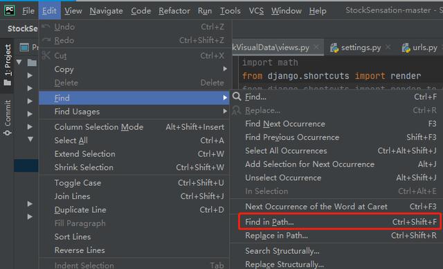 windows下选择 Ctrl+shift+F 即可在Pycharm中全局搜索,或者在Edit-Find-Find in Path 找到该功能: