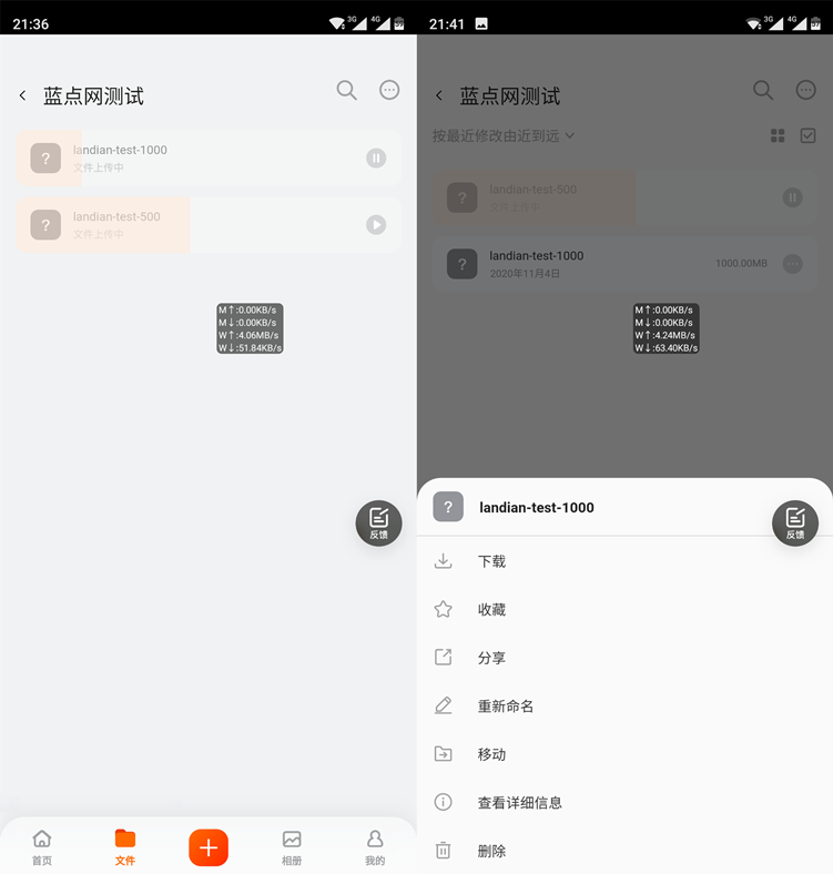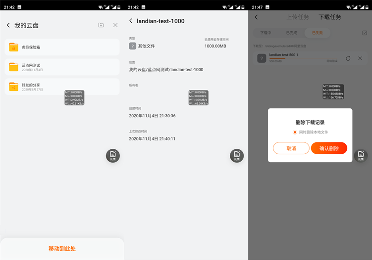 测试环境:浙江电信家庭宽带下行速度200M上行速度40M ,Android 9.0 使用5GHz WiFi安装阿里云盘最新版。