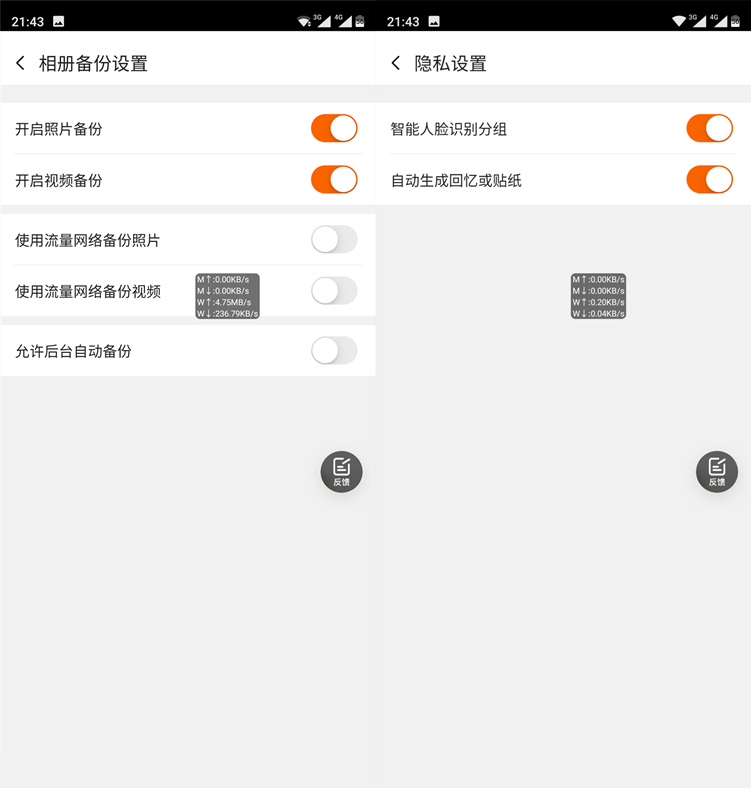 ▲阿里云盘APP相册备份功能,若使用智能人脸和回忆相册需要在隐私设置里开启