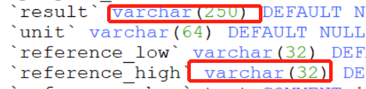 查看建表SQL语句,我们发现 result 和 reference_high 是varchar类型,并不是数值类型,所以出现了查询结果与预期不符的情况