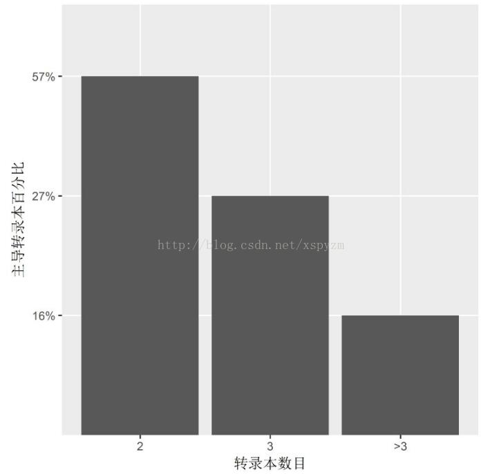 ggplot(a,aes(x=a[,1],y=a[,2]))+geom_bar(stat="identity")+xlab('转录本数目')+ylab('主导转录本百分比')