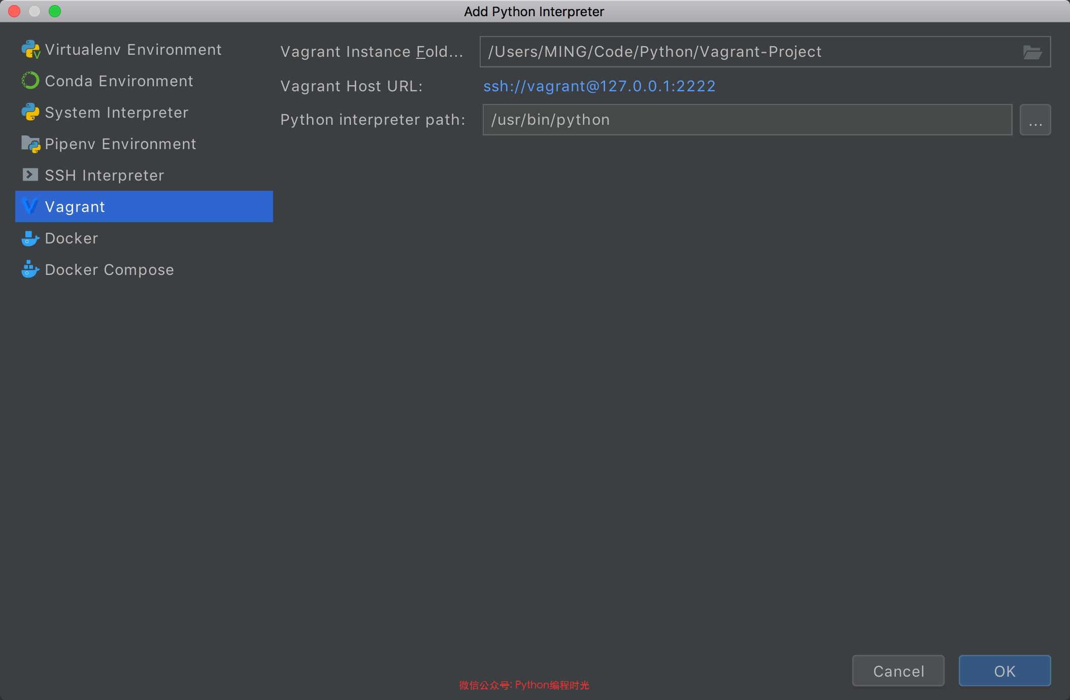最后,再在 Project -> Python Interpreter 里添加 Vagrant 虚拟机里的 Python 解释器