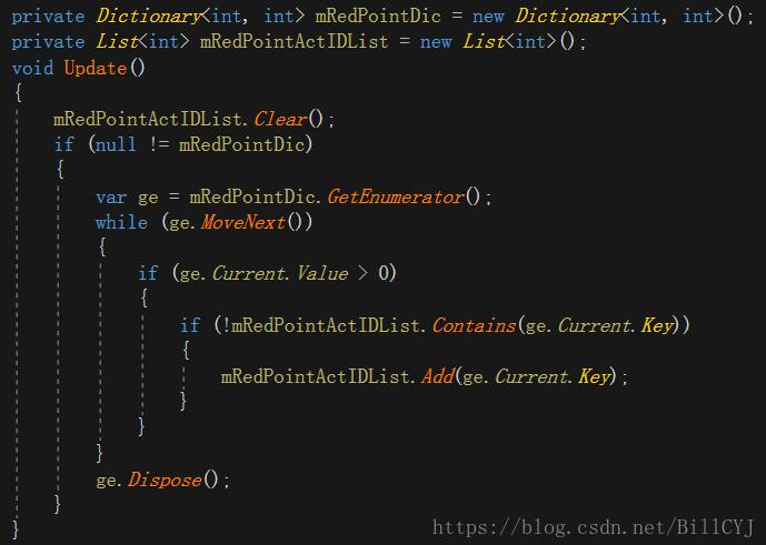 //调用成员Keys,会产生额外GC:Dictionary本身储存数据是成对储存的,也就是KeyValuePair,所以