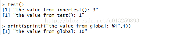 原因在于,在函数test()内部定义的函数innertest()中执行了assign函数,该函数在最顶层全局层次中的变量i赋值10,但是该层中并没有该变量,于是就就在最顶层.GlobalEnv中创建了该变量i并给其赋值,这样在不同的函数层次中都有变量i,优先引用离自己最近的同级(已顺序执行)或者上级层次中的变量,所以i出现了三个不同的输出值。