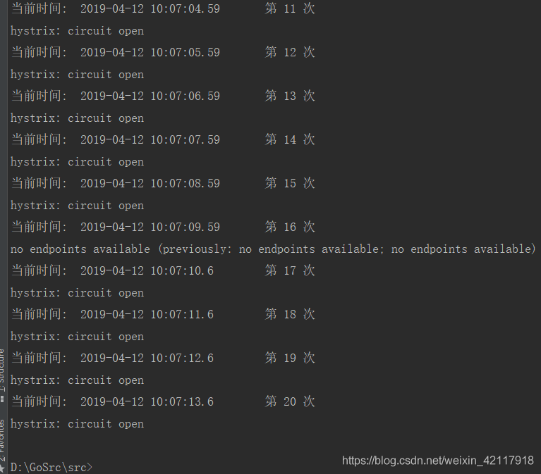 2、 circuit开启后请求熔断生效(输出内容:hystrix: circuit open)