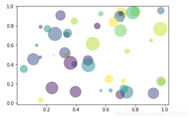 import numpy as np import matplotlib.pyplot as plt # Fixing random state for reproducibility np.random.seed(19680801) N = 50 x = np.random.rand(N) y = np.random.rand(N) colors = np.random.rand(N) area = (30 * np.random.rand(N))**2 # 0 to 15 point radii plt.scatter(x, y, s=area, c=colors, alpha=0.5) plt.show()