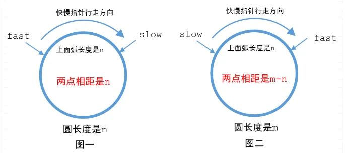 快指针每次走两步,慢指针每次走一步,所以每走一次快慢指针的间距就要缩小一步,在图一中当走n次的时候就会相遇,在图二中当走m-n次的时候就会相遇。这样就解释清楚了读者的疑问了。