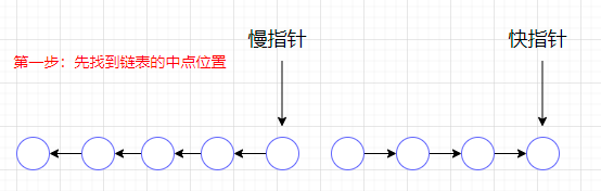 快指针每次前进两个单位,慢指针每次前进一个单位并修改其next节点指向前一个节点,所以当快指针到达链表末尾的时候(空节点或空节点的前一个节点),慢指针刚好在中间,如下图所示