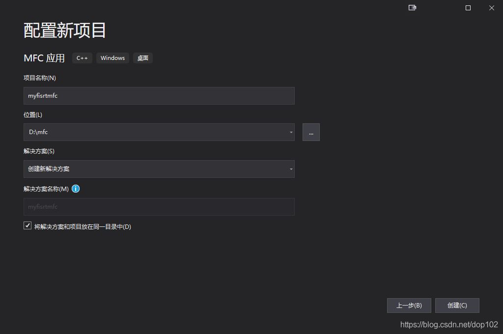 然后点下一步,配置项目,这里我命名的是myfisrtmfc