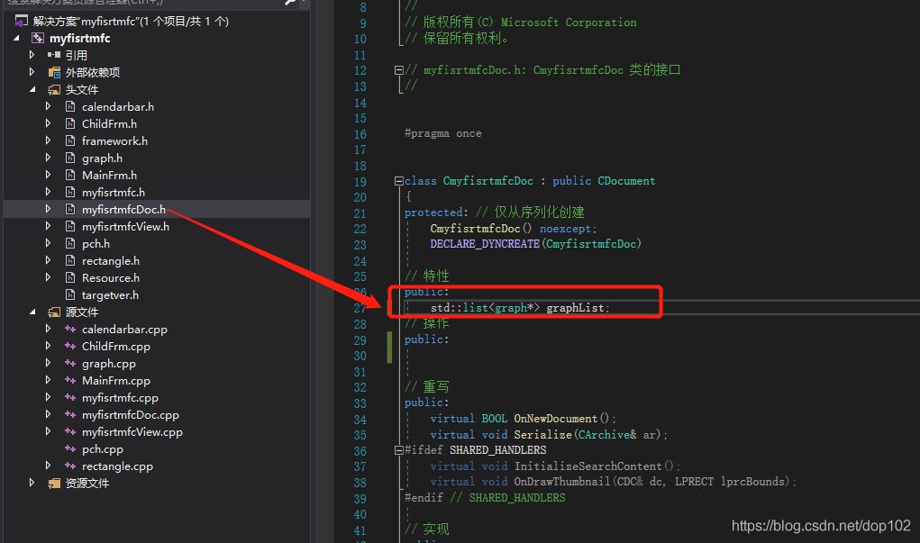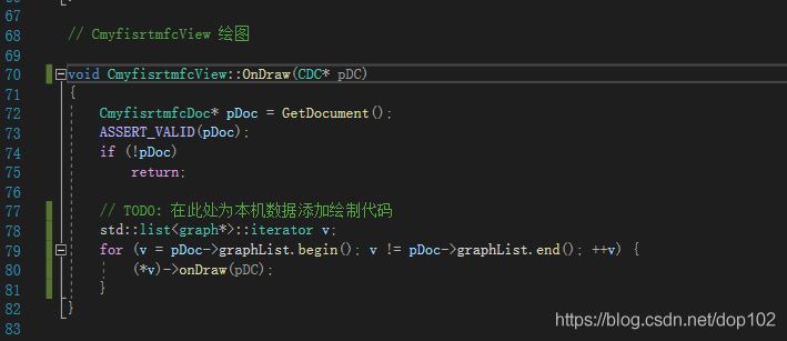 CmyfisrtmfcDoc* pDoc = GetDocument(); ASSERT_VALID(pDoc); if (!pDoc) return; pDoc->graphList.push_front(new rectangle(50, 50, 100, 100)); Invalidate();