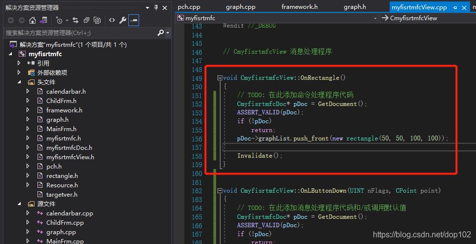 这里要调用用OnRectangle()函数,之前生成的函数,我们现在添加下面的代码: