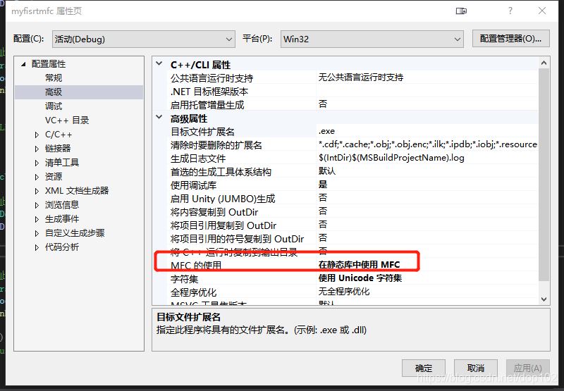 点击项目中的属性,在配置属性中选择高级,MFC使用 静态库,在编译一次,生成.exe可以其他电脑上不依赖动态库也能打开了。