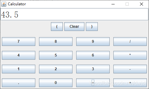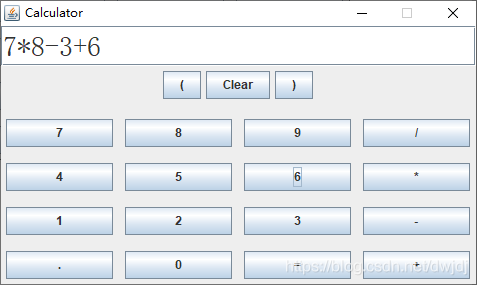 首先先设计一个GUI界面,先设置一个JFrame容器,容器中创建两个面板和若干按钮,先把按钮要显示的文字存入字符串数组,然后依次创建几个按钮。在设置一个文本框,用来接收用户输入的内容,centerPanel.setLayout(new GridLayout(4, 4, 12, 16));设置中间面板的布局为网格布局,并指定该容器的行数和列数以及组件之间的水平、垂直间距。centerPanel.setBorder(BorderFactory.createEmptyBorder(5, 5, 5, 5));为面板创建一个框,框的头部为5像素,左为5像素,底部为5像素,右为5像素宽。再设置单行文本域的大小,字体,风格和字号,然后为各按钮设置监听器。定义一个StringBuffer类,用于保存触发产生的内容,在用txt.setText(r.toString());方法将内容输出在文本框中,clear按钮触发后,用r.delete(0,r.length());方法清空字符串中的内容并将结果显示在文本框中,“=”按钮是把触发器触发的数字保存StringBuffer里面,然后用该类的toString()方法返回StringBuffer缓冲区中的字符对象,用String类型的变量接收,该字符串接收到的就是一个中缀表达式,创建一个类,该类用于将输入的中缀表达式进行计算,把计算的结果返回给“=”按钮触发器中的result变量,把该变量转化为字符串输出在文本框中。