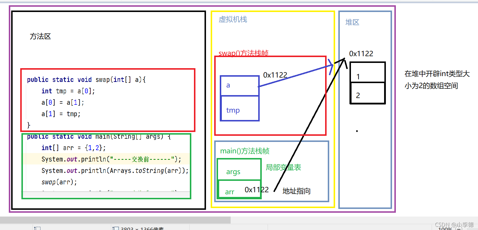 数组开辟的空间是在堆中进行开辟,但是在栈中相当于存储的是数组的首地址,所以在上面例子中,交换的是引用类型中的值,所以能够进行交换原来数组中值。