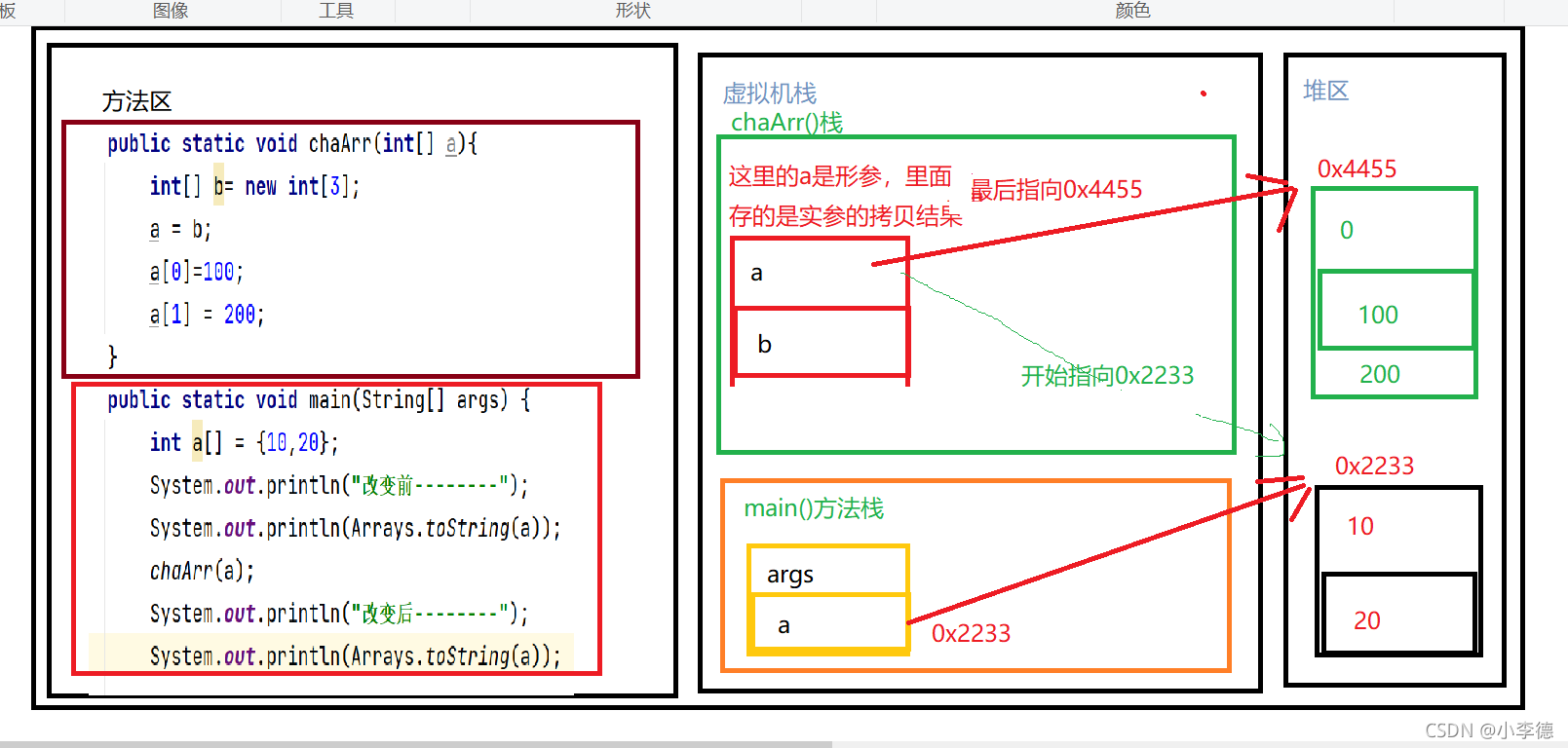 我们可以发现,在chaArr()方法中我们改变的值在数组中没有发生变化,这是为什么,这是因为,我们在chaArr()中将a的引用地址进行了改变,之后操作的是新创建的数组b中的结果,所以a中的结果没有发生改变,图示如下: