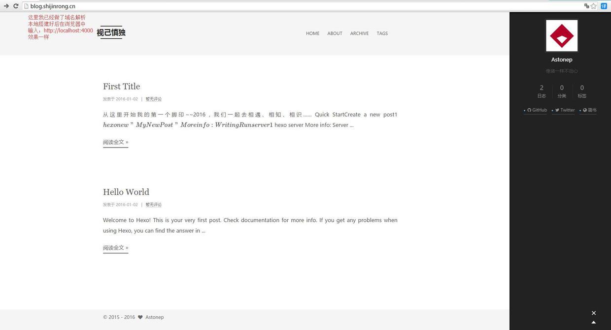 域名绑定成功,域名解析成功,因此你在浏览中输入aierui.github.io或者现在blog.shijinrong.cn均可以访问到主页。