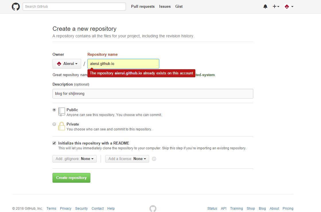 首先在GitHub上创建一个仓库repository,注意仓库名称必须为aierui.github.io,也是你之前在本地建立的文件夹名称