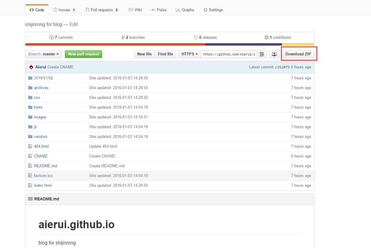 下载博客模板的ZIP,去到你frok的仓库地址:https://github.com/你的用户名/你的用户名.github.io。点击右下角的Download ZIP,你会得到一个名为「你的用户名.github.io-master.zip」的压缩包。