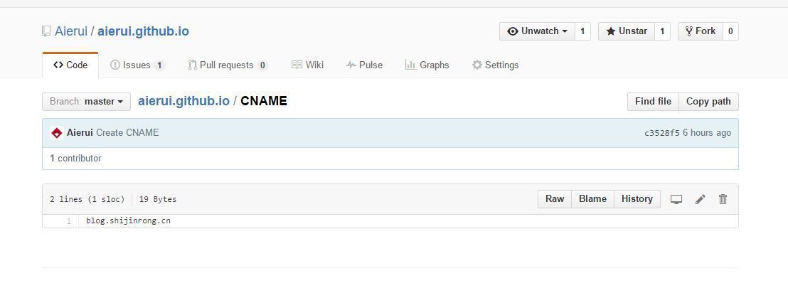 去到你的aierui.github.io 仓库,点击 CNAME(没有自行创建) ,再点击右下角的 铅笔 编辑,将 blog.shijinrong.cn 改成你的域名
