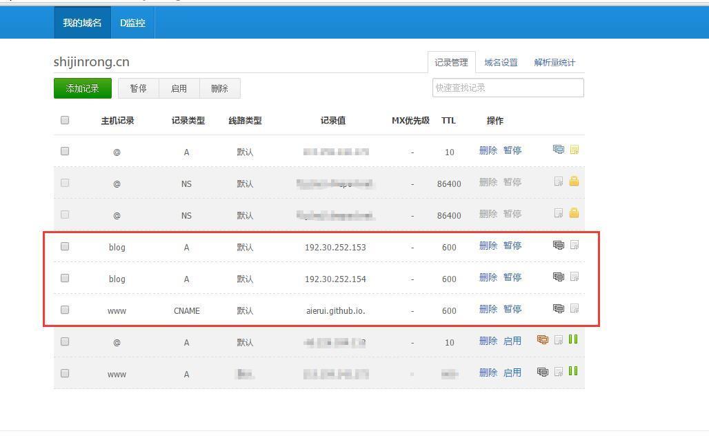 领取到域名后进行解析,进入到我的域名管理,添加域名,如下图设置。我这里设置了一个三级域名blog,大家可以自行忽略。设置后访问的就是blog.shijinrong.cn了,不是shijinrong.cn哟~~~~