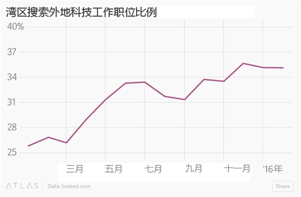 Indeed.com发现,在硅谷地区,搜索外地职位的比例正在增多。今年2月1日,该网站上来自硅谷的科技职位搜索请求有35%瞄准了其他地区。这一数据根据过去30天的平均数计算,而且根据季节性因素进行了调整,相比去年同期增长了30%。