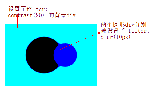 意思是,上面两圆运动的背后,其实是叠加了一张设置了 filter: contrast() 的大白色背景,而两个圆形则被设置了 filter: blur() ,两个条件缺一不可。