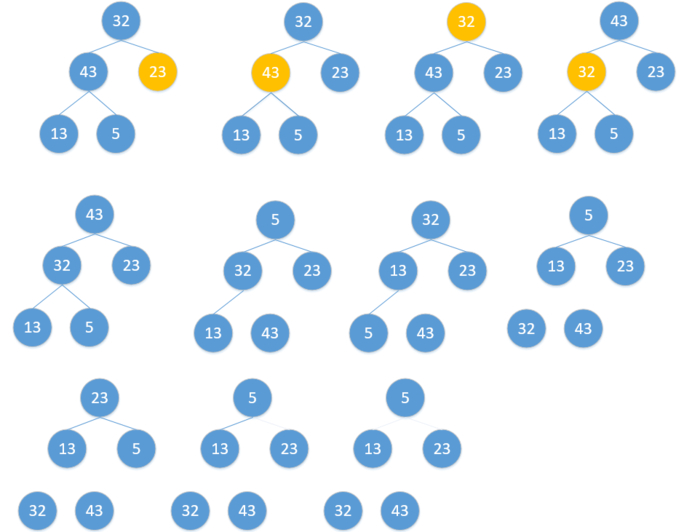 - 将根节点与最后一个节点交换,然后断开最后一个节点。