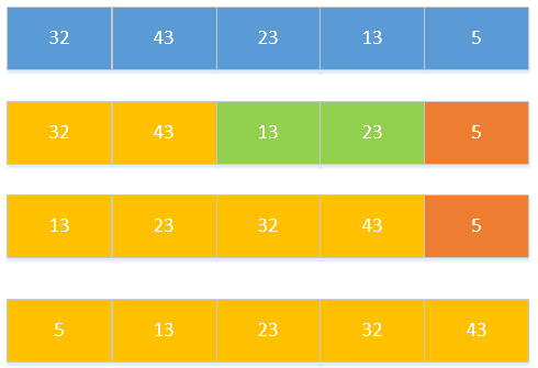 - 将数的个数设为n,取奇数k=n/2,将下标差值为k的书分为一组,构成有序序列。
